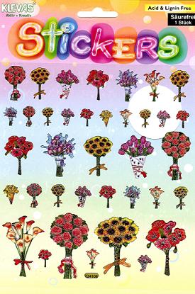 Auf diesem bunten transparenten Stickerbogen befinden sich Blumensträuße in verschiedener Anzahl und Größe.