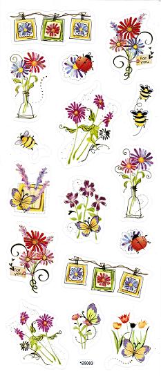 Auf diesem bunten transparenten Sticker befinden sich diverse Blumen in verschiedener Anzahl und Größe.