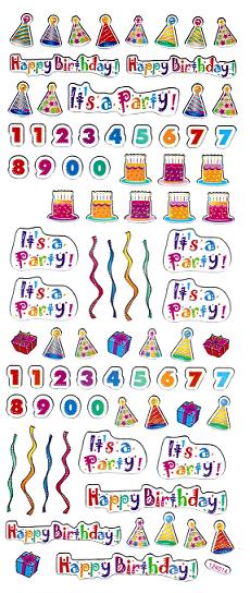 Alle Schriftzüge, Zahlen und Partyteile auf diesem Stickerbogen sind einzeln zu verwenden.