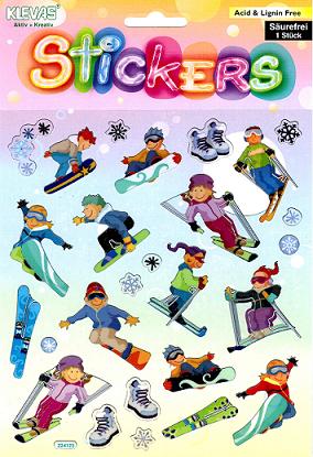 Auf diesem bunten transparenten Stickerbogen befinden sich Motive zum Thema Ski und Snowboard in verschiedener Anzahl und Größe.