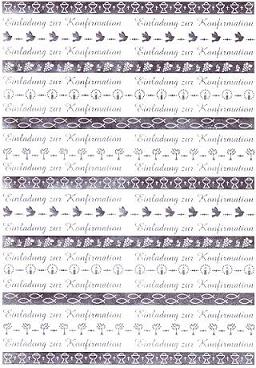Auf diesem wunderschönen Motiv-Transparentpapierbogen Bordüren silber von Ursus sind verschiedene christliche Motive und 24x der Schriftzug Einladung zur Konfirmation einseitig aufgedruckt.
