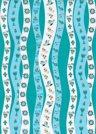 Auf diesem wunderschönen Motiv-Transparentpapierbogen Glory petrol von Ursus sind verschiedene christliche Symbole auf weiße und hellblaue Bänder einseitig bedruckt.