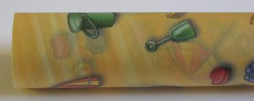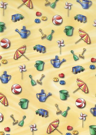 Dieses schöne Motiv-Transparentpapierbogen von Ursus aus der Serie Kinderparadies, Sandkasten ist mit kleinen Sandförmchen, Gießkanne, Sonnenschirmchen, Spielzeug und Wasserball auf gelben Hintergrund einseitig bedruckt.
